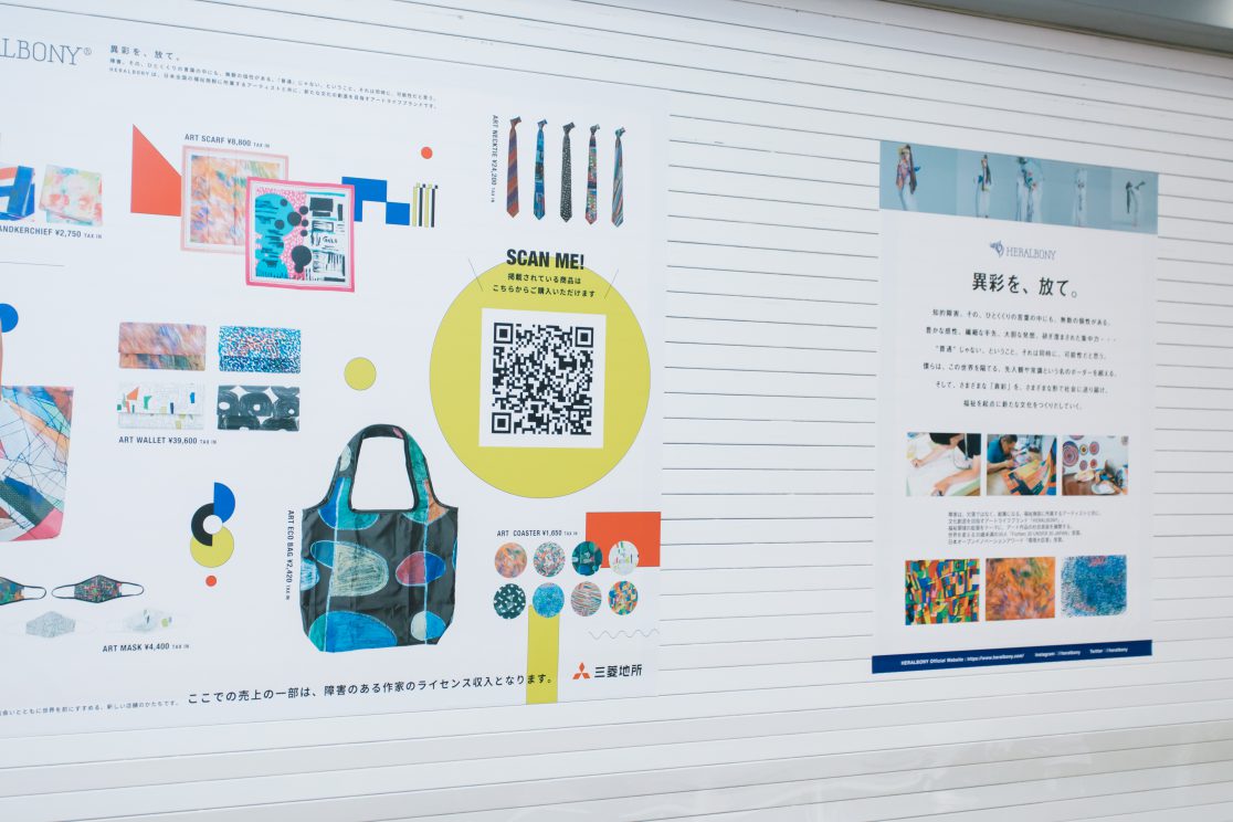 壁というデッドスペースを活かし、商品紹介〜オンラインストアでの購入が可能に。売上の一部は障害のある作家に還元。